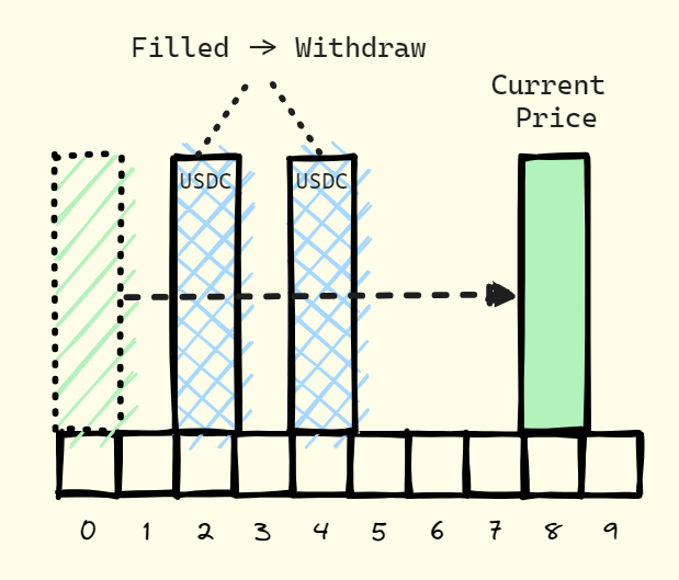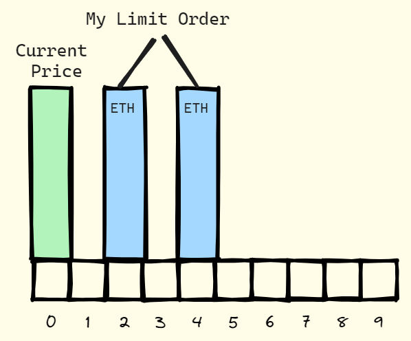 Let's assume in an ETH-USDC pool, the current price of ETH is at Index 0, and my limit orders are at Index 2 and 4: