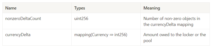 Here, nonzeroDeltaCount indicates the total number of unsettled token types, and currencyDelta indicates how many of each unsettled token remain.