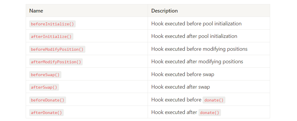 A hook is a kind of plugin that can be added to a pool. In general, a hook refers to a function containing logic that is executed when a specific event occurs. In Uniswap, the events that trigger hooks are divided into three categories: Pool Deployment(Initialization), Liquidity Provision & Withdrawal, and Swap. Accordingly, eight hooks are defined: