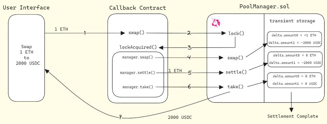 lockAcquired, three functions from the PoolManager contract are called. First, theswapfunction, which stores thedeltavalues resulting from the swap (+1 ETH, -2000 USDC).Next, 1 ETH is sent to the PoolManager contract, and the