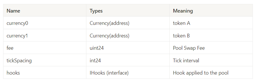 A notable point here is that the pool identifier includes the interface (IHooks). This means that each pool in Uniswap V4 can have exactly one hook. Moreover, pools with identical configurations but different hooks can coexist. For instance, a USDC-ETH pool with an on-chain oracle hook can coexist with a USDC-ETH pool with a limit order hook.
