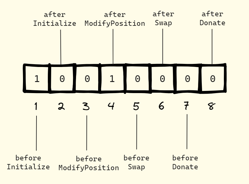 This struct represents the state of the pool. Compared to V3, oracle-related information and the unlocked flag to prevent re-entrancy attacks have been removed, and fee-related information has been added. This struct is initialized when the pool is deployed (initialize). The fee-related variables represent the denominator value (e.g., if protocolSwapFee = 20, then the protocol swap fee is set at 1/20 = 5%).