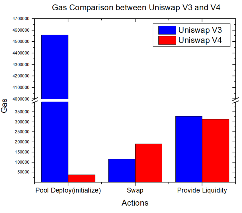 The results of the gas test are as follows, based on the code of Uniswap V3 and V4. Contrary to what was mentioned above, excluding pool deployment costs, V4 consumes higher or similar levels of gas for swaps and liquidity supplies compared to V3.